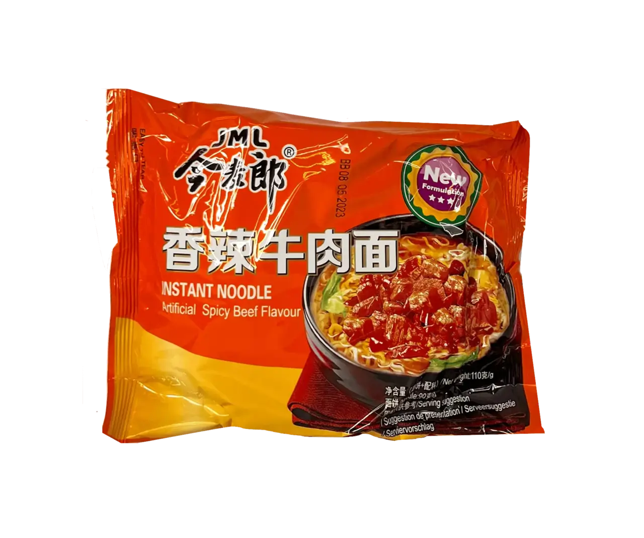 Ingredienser: Nudlar: vetemjöl (54.61%), palmolja (innehåller antioxidationsmedel E306), salt, surhetsreglerande medel (E501, E500), fuktighetsbevarande medel (E452). Såspaket: raffinerad palmolja, chilisås (1.92%) [chili, salt, vatten], artificiell biffarom (1.5%), salt, sojasås (sojabönor, vete, salt, vatten) ingefära, kryddor (ingefära pulver, vitpeppar), färgämne (E160c),vitlök, vitamin E. Soppulver: salt, smakförstärkare (E621), jästpulver, chilipulver (0.93%), socker, kryddor (vitpeppar), färgämne (150a). Grönsakspåsen: torkad vitkål, torkade morötter, torkad schalottenlök.