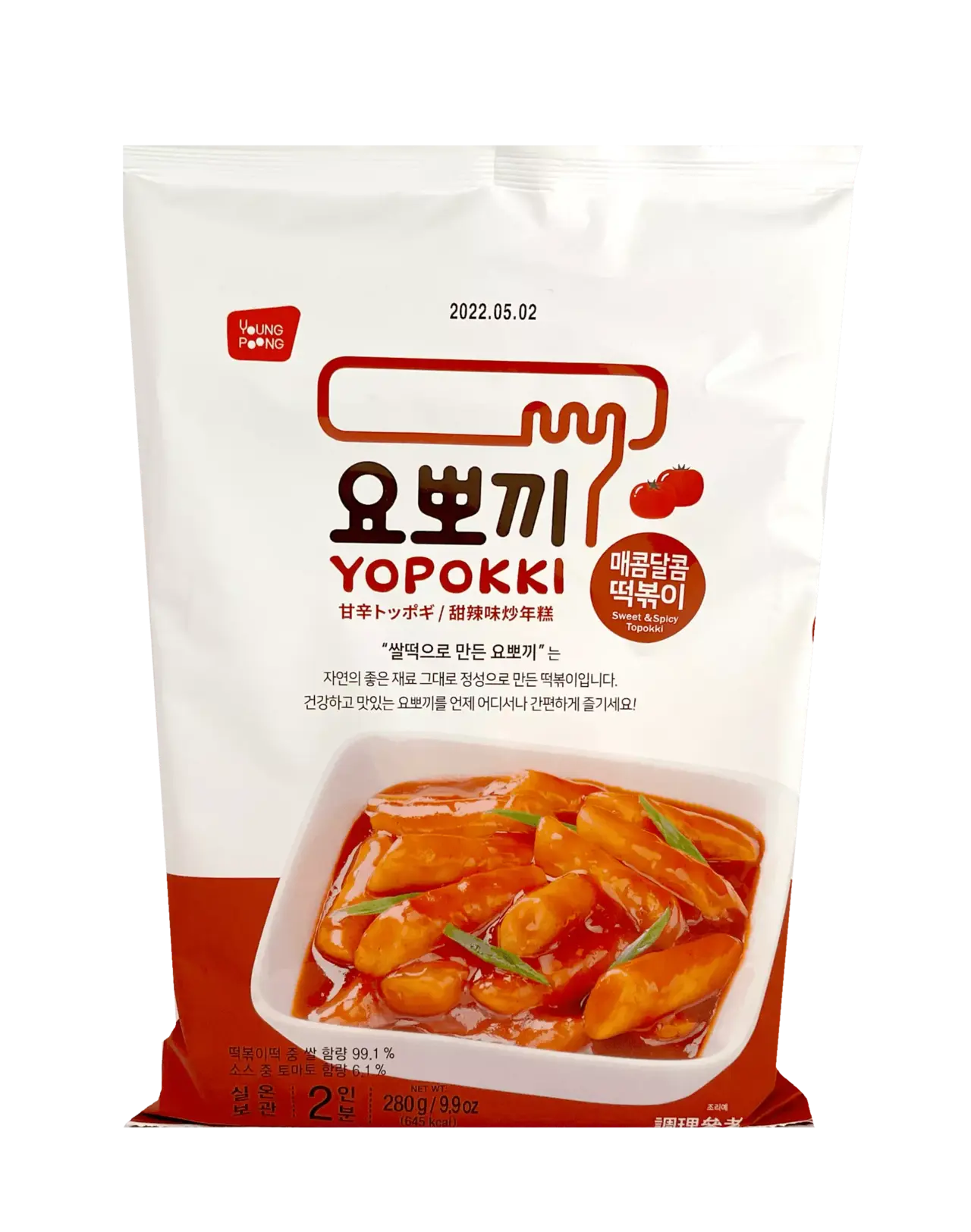 Ingredienser: Ris kaka [Ris 99.1% (Importerad produkt), raffinerad salt (koreansk produkt), surhets regulator, spannmålssprit]/ Sås [Tomat ketchup (tomat paste (importerad produkt), hög fruktos, majs sirap, fermenterad vinäger, raffinerad salt, vit socker, låg söt socker, röd peppar paste (röd peppar pulver, raffinerad salt, vitlök, lök), fettfri sojaböna pulver, raffinerad salt], hög fruktos majssirap, sammansatt krydda, äpple puré, lök, raffinerad risvin, vitlök, röd peppar pulver, raffinerad salt, chili olja, surhetsregulator, citron extrakt, oleoresin paprika, emulgeringsmedel, smakförstärkare, svart peppar pulver, xanthan gum].