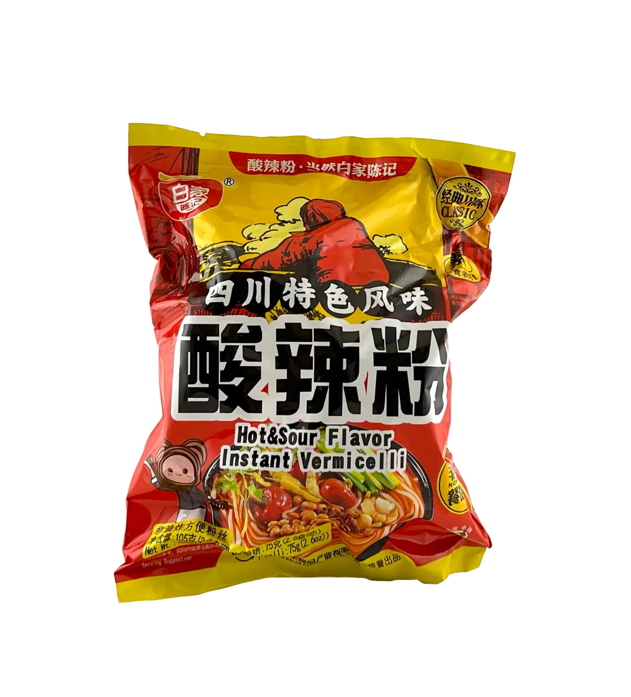 Vermicelli sötpotatisstärkelse, majsstärkelse (sulfit), palmolja, förtjockningsmedel E412, salt, surhetsregulator E330, palmolja, rapsolja, chili, schalottenlök, ingefära, sesam, jästextrakt. Pulversalt, surhetsregulator E330, socker, smakförstärkare E621, E635, vinäger