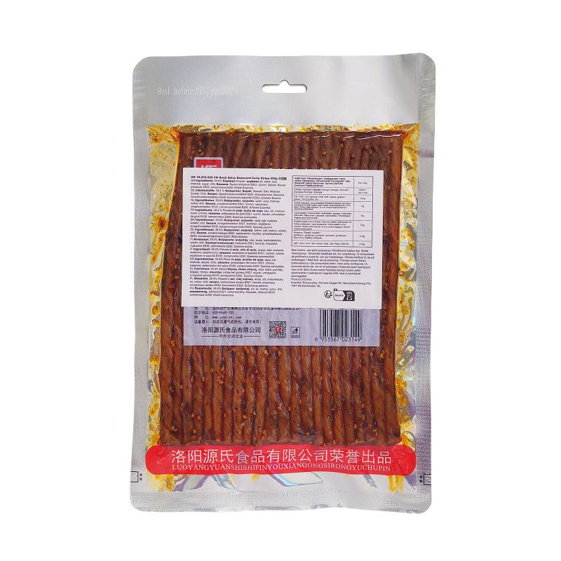 配料:39.4%大豆粉大豆油、水、盐、麦芽糖、糖、辣椒、芝麻、小茴香、香辛料、增味剂E621、增味剂E635、防腐剂202、食用香精。