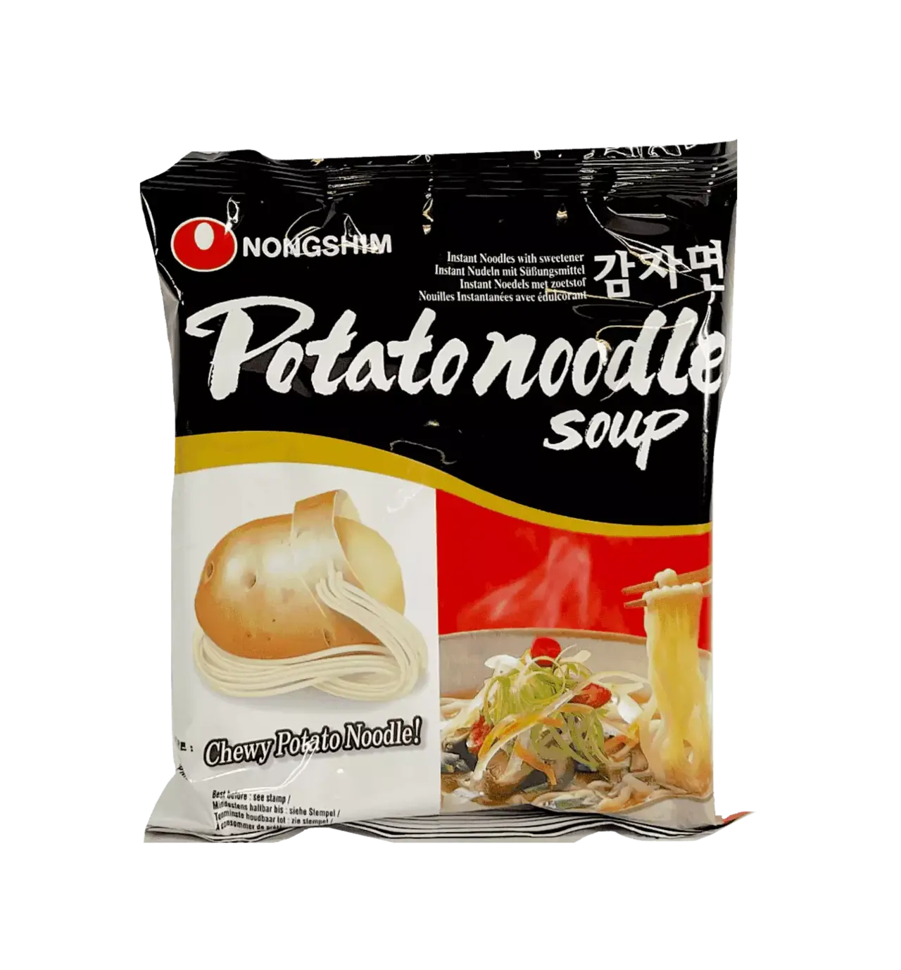 面条:马铃薯淀粉 49%、小麦粉、棕榈油、小麦面筋、马铃薯粉 3%、酸度调节剂:E501、E339、E500、抗氧化剂 E306、乳化剂 E322(含大豆)、调味剂(软糖糊精、大蒜提取物、甜味剂 E420)、绿茶提取物、色素:E101。